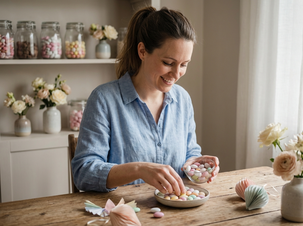 Pour une réunion intime, le sachet en lin ou en organdi s’invite discrètement à chaque place, soulignant la décoration de la table avec élégance. Les grandes tablées misent sur des présentoirs spectaculaires : alignements de pots, pyramides colorées, arrangements fleuris où s’intègrent les contenants à dragées. Il existe mille manières d’adapter la présentation à l’ambiance : champêtre, moderne, ou résolument minimaliste.